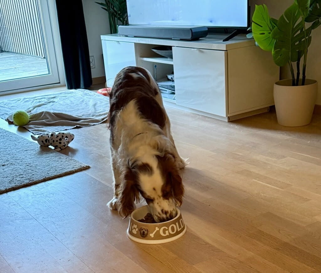 Et rolig måltidsøyeblikk – trygghet, rytme og nærhet i et hjemmemiljø hunder faller naturlig til ro i.